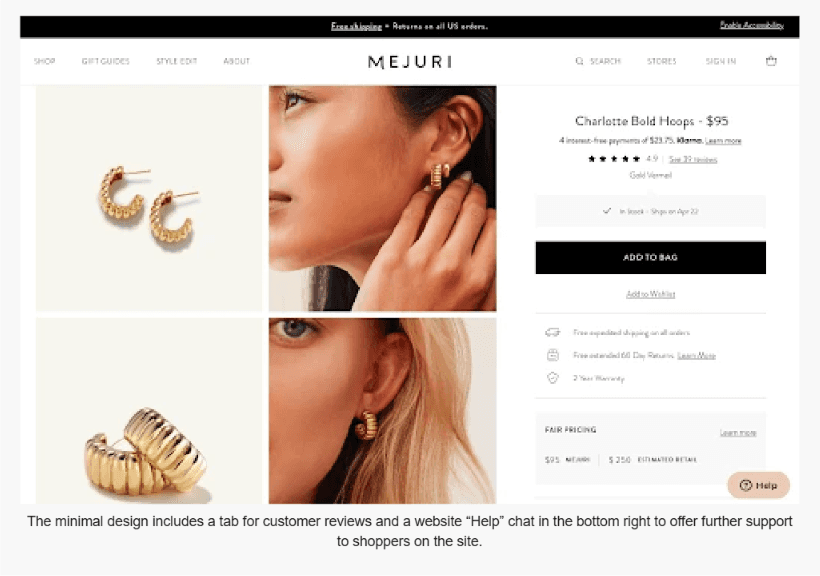 Notice how Mejuri manages to provide all this information without making the design look cluttered or overwhelming to the eye? It’s this combination of beautiful branding that also addresses common customer questions and objections that helps to encourage a high conversion rate.