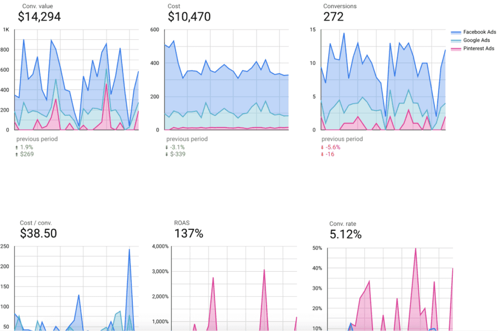 We do it by analyzing data from metrics, ad creative, audiences, and ad channels. Google Data Studio is the tool we use to track everything and find valuable insights: