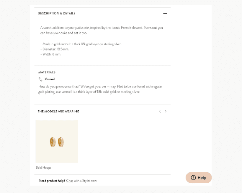 Mejuri’s product detail pages also have info about the materials, how to wear, size/dimensions, shipping, product care: