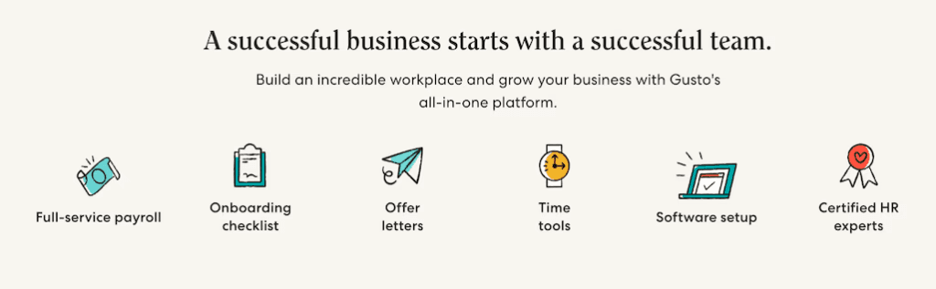 Gusto, a payroll and HR platform, notes six different benefits; however, they keep things minimal with simple icons and 2-3 word descriptors.‍