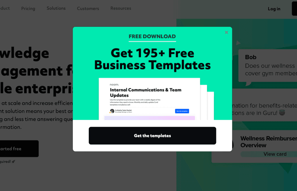 Here’s a solid example from GetGuru, offering 195+ Free Business Templates, an offer that’s value-heavy and related to the needs of their target audience.