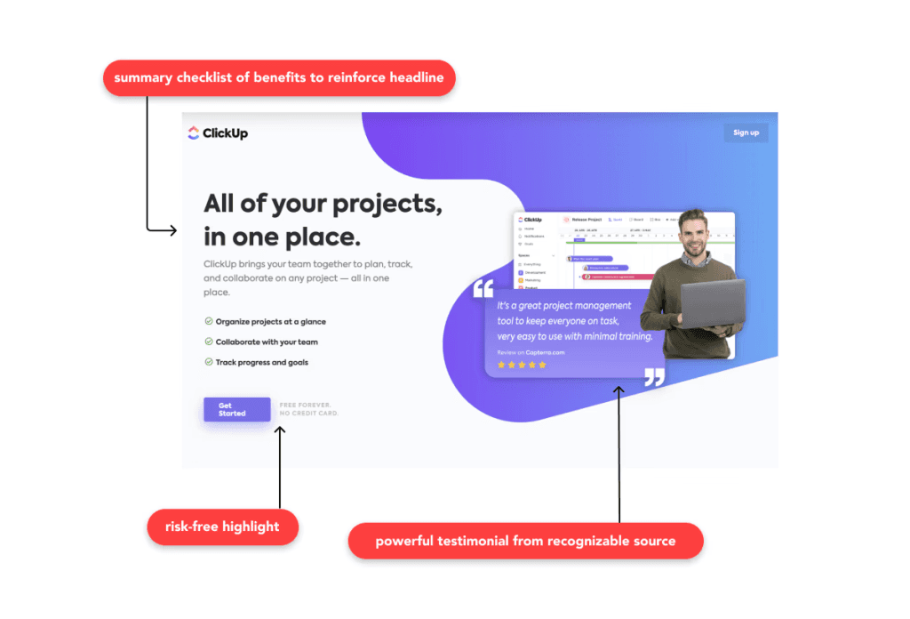 For example, this landing page for ClickUp has the headline: All of your projects, in one place. The strength of this headline is in its simplicity. With just a few words, we know who we’re working with–ClickUp–and what they offer–a solution for managing multiple projects.