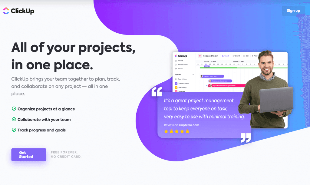 ClickUp keeps things relatively simple. Their hero contains a logo, sleek purple shapes, and an image of a grinning millennial holding a laptop. Notably, they also include a screenshot of the software’s dashboard, providing the viewer with a glimpse at how ClickUp might work. Additionally, they include a screenshot of a five-star review to begin establishing social proof.