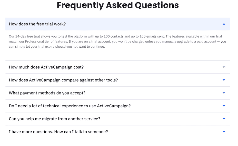 Here’s a sample from Active Campaign which tackles the most important questions first, like “How does the Free Trial Work?” and “How much does ActiveCampaign cost?”
