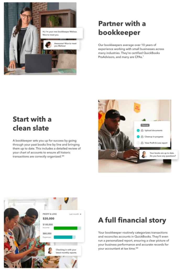 Laid out in three simple sections, this features section harps on the primary benefits of QuickBooks:
