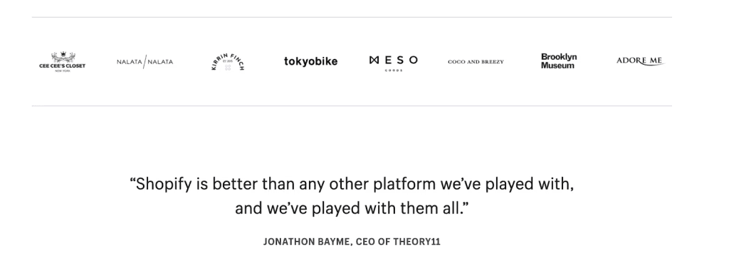 Below we have an example from Shopify that combines both a “brag bar” of brands using their product along with a quote from the leader of a recognizable e-commerce brand (their core audience).