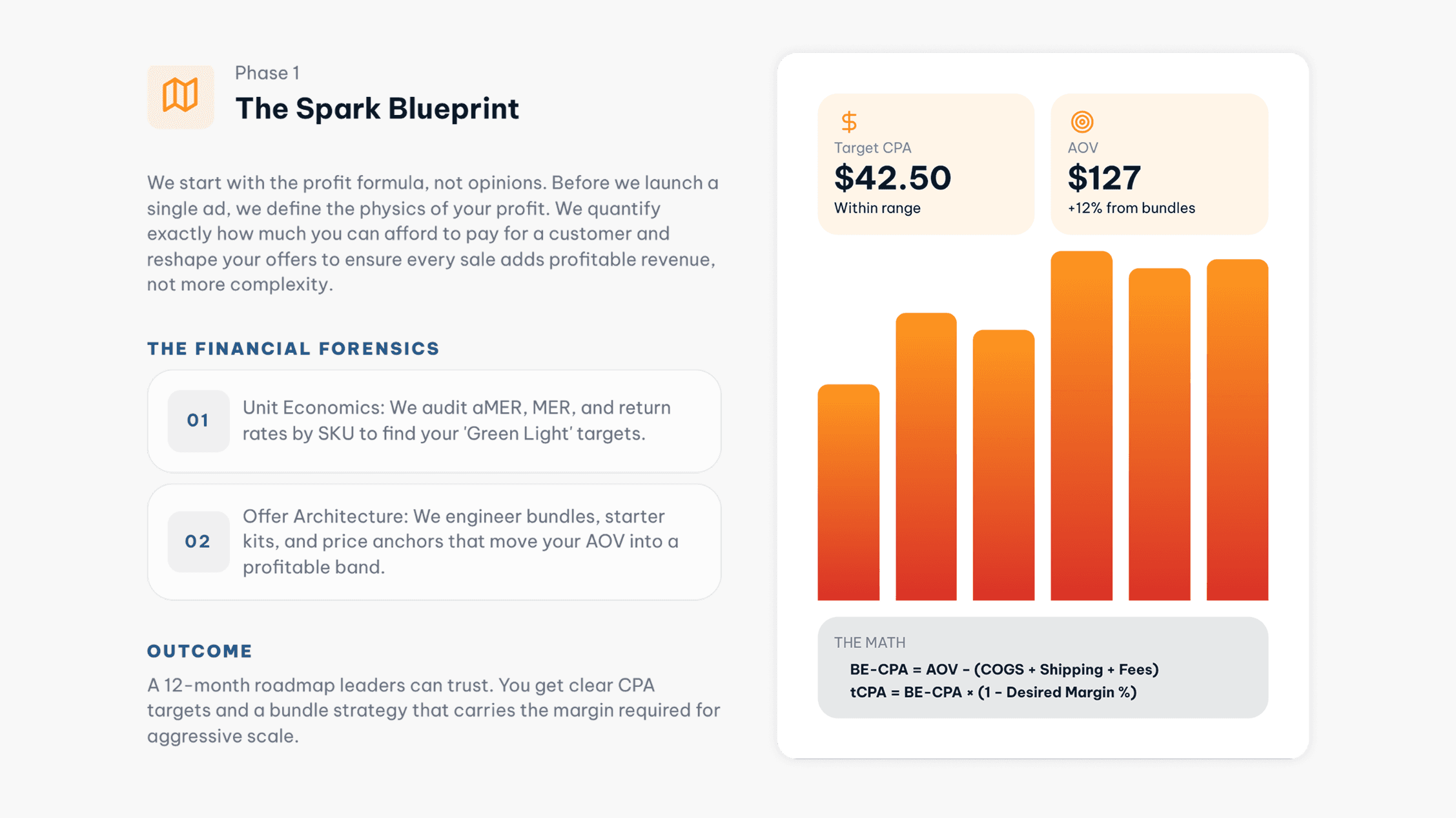 The AOV is not a fixed number you accept. The CPO engineers offer architecture through bundles and price anchors designed to move your AOV into a profitable band. The tCPA is your Green Light target, the number you need to hit to reach your actual EBITDA goals.